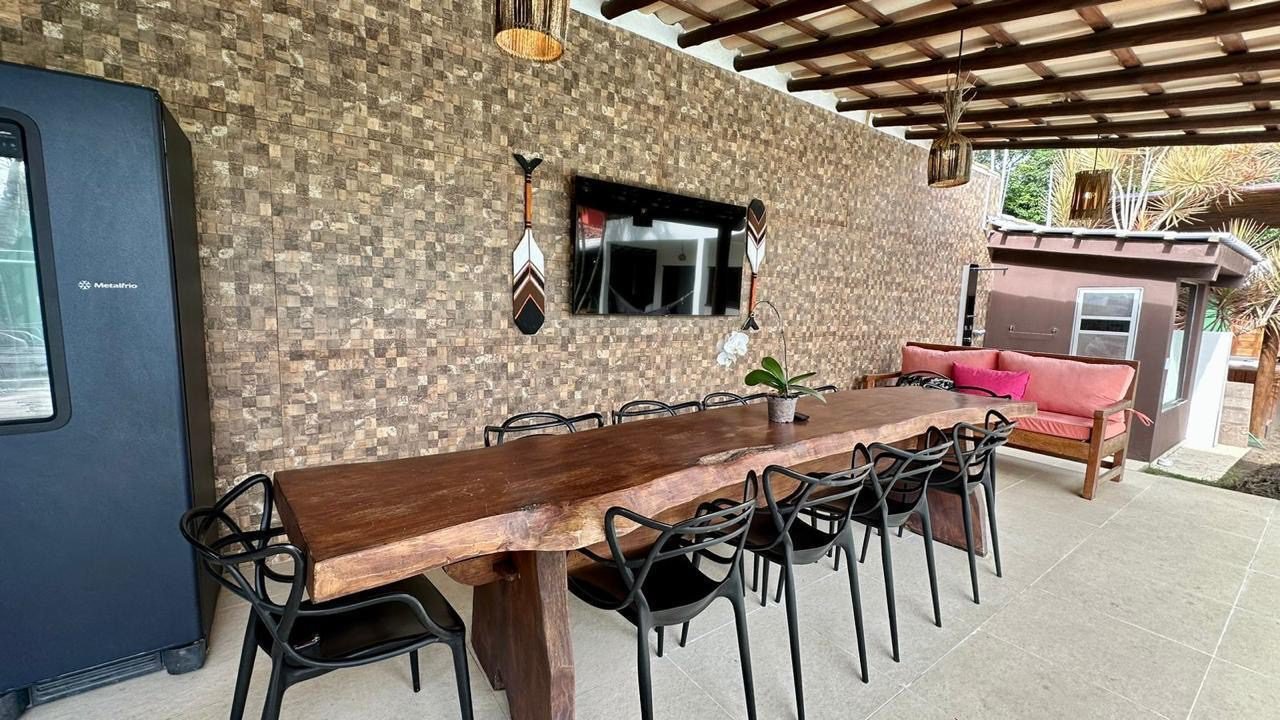 Área gourmet : mesa para 10 pessoas , tv 65 , churrasqueira , cervejeiro grande -5.5, adega climatizada para 52 vinhos,pia grande e fogão 4 bocas , sofá surubao