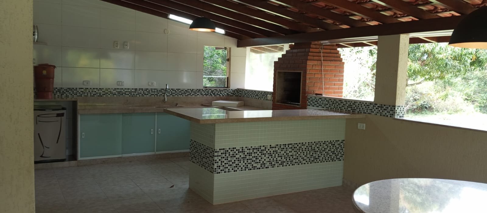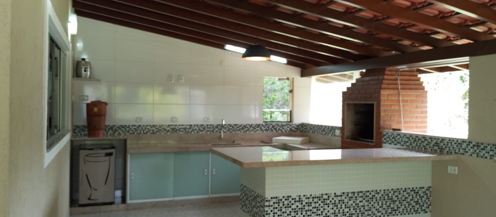 Área de lazer privativa com churrasqueira, fogão e lavabo
