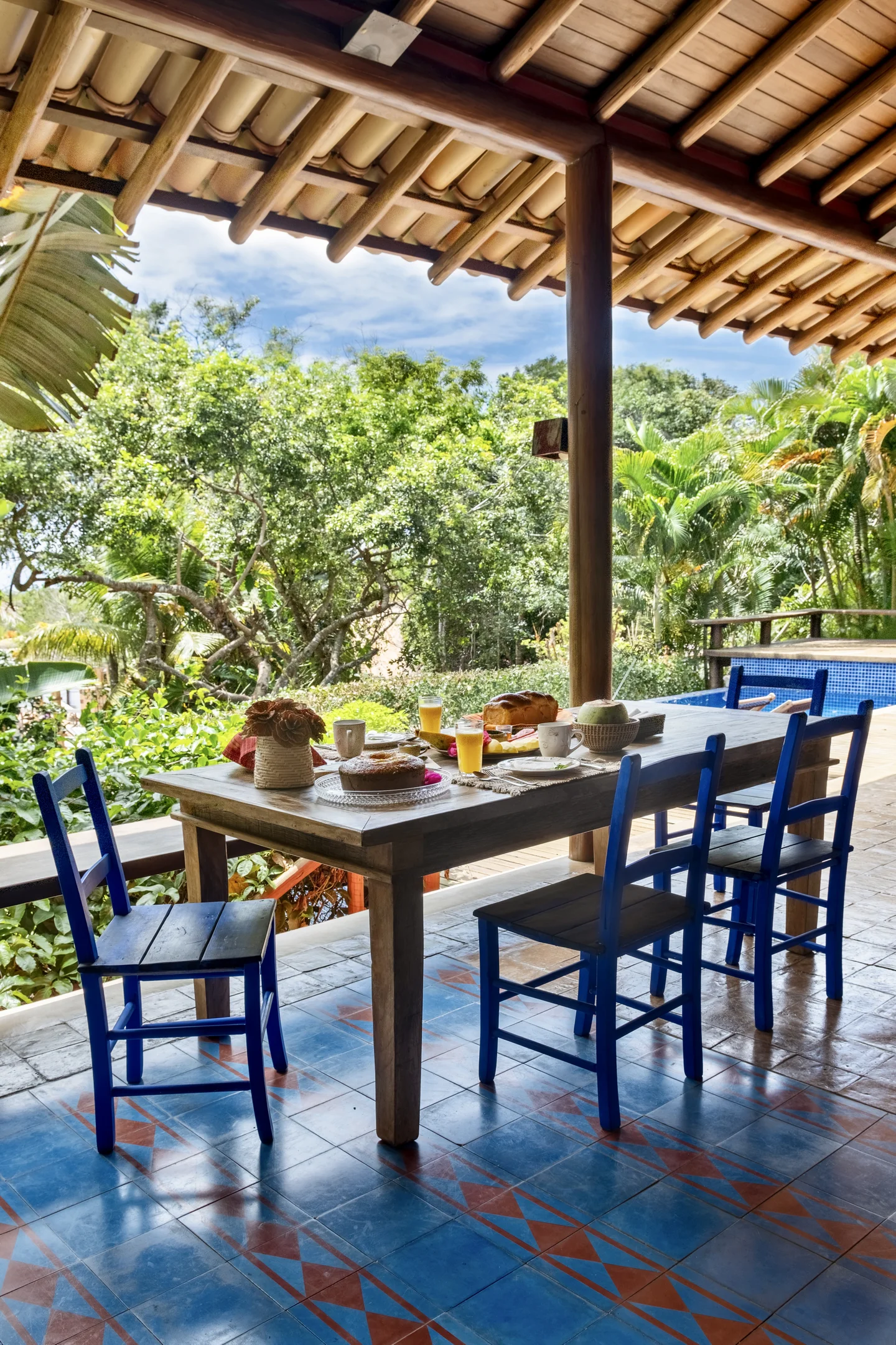 Deck com piscina, espreguiçadeiras em madeira e um jardim bem cuidado, que garante tranquilidade e exclusividade.